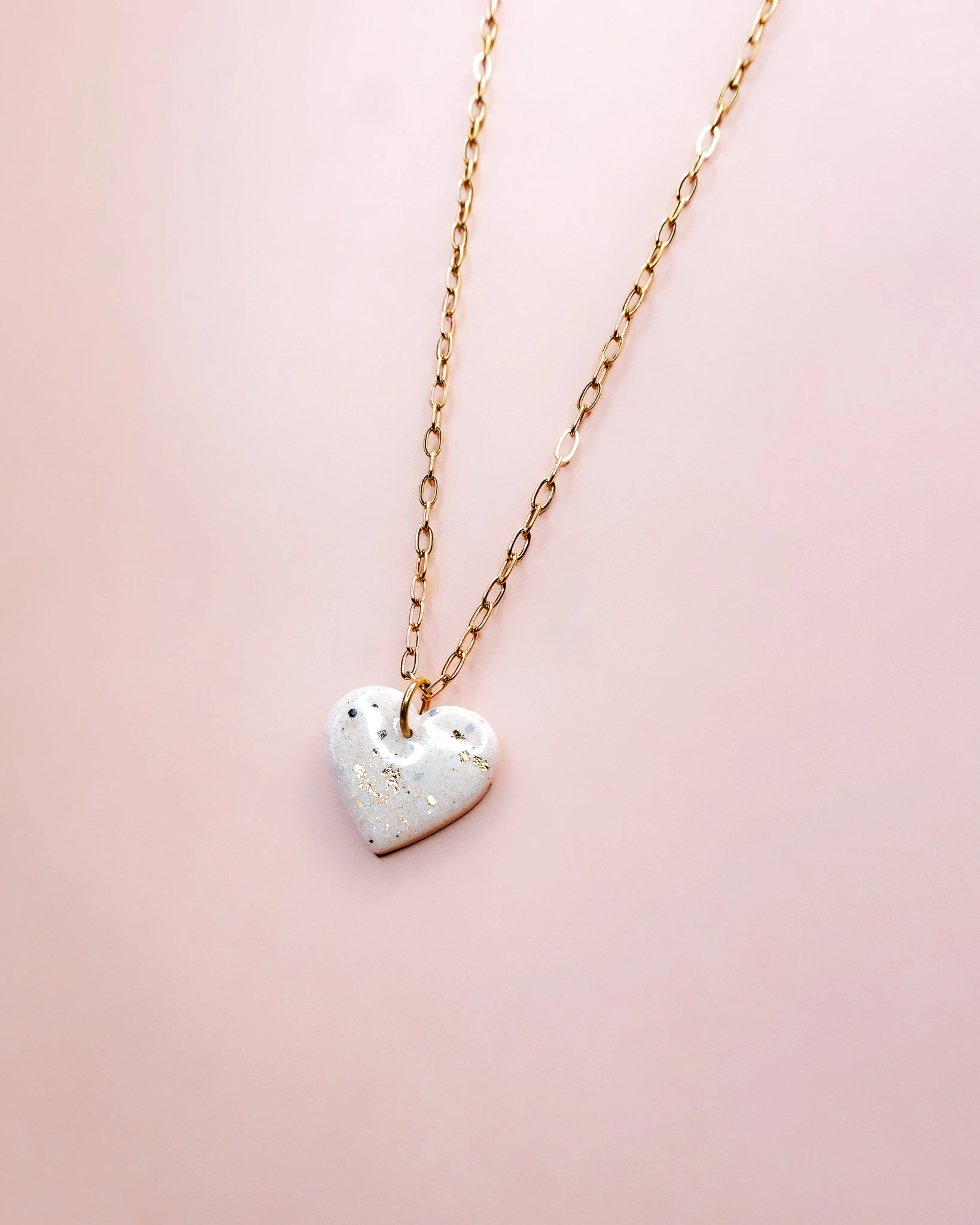 Made from polymer clay, adorned with gold leaf and protected by a thin layer of resin, this heart pendant is mounted on a hypoallergenic stainless steel ring and chain, suitable for sensitive skin.