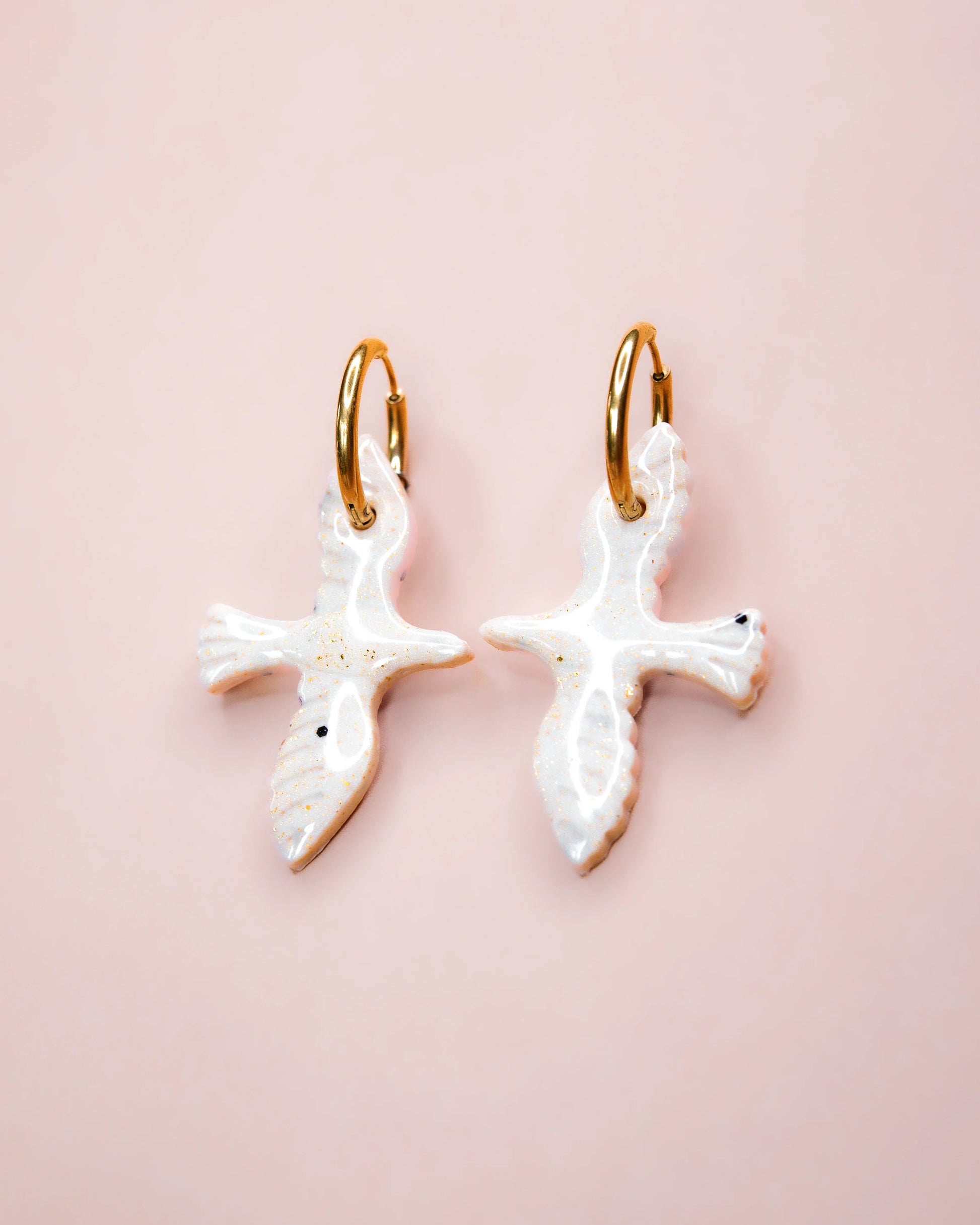 Made from polymer clay, adorned with gold leaf and protected by a thin layer of resin, these bird charms are mounted on hypoallergenic stainless steel hoops, suitable for sensitive skin.