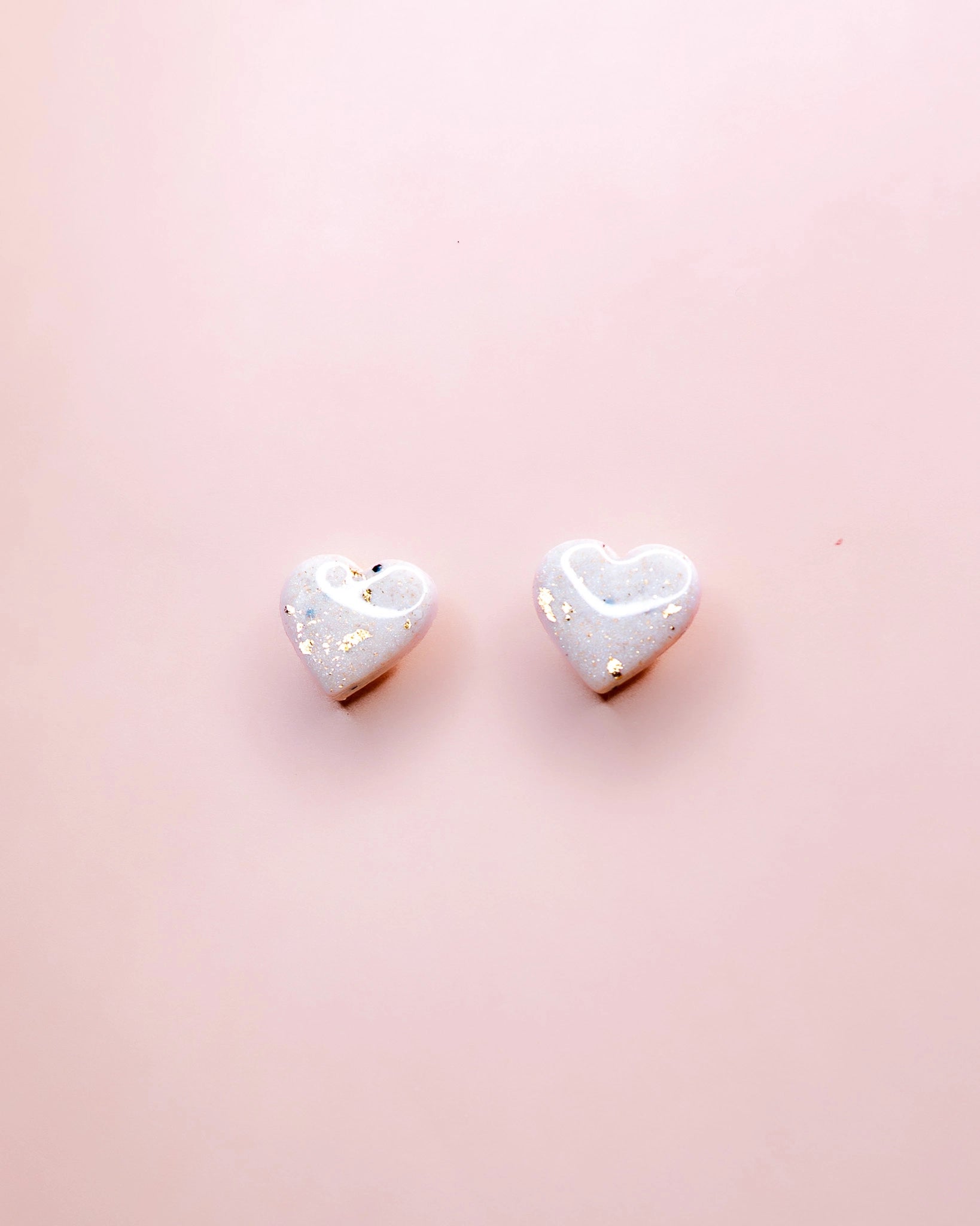 Made from polymer clay, adorned with gold leaf and protected by a thin layer of resin, these heart earrings are mounted on hypoallergenic stainless steel earring studs, suitable for sensitive skin.