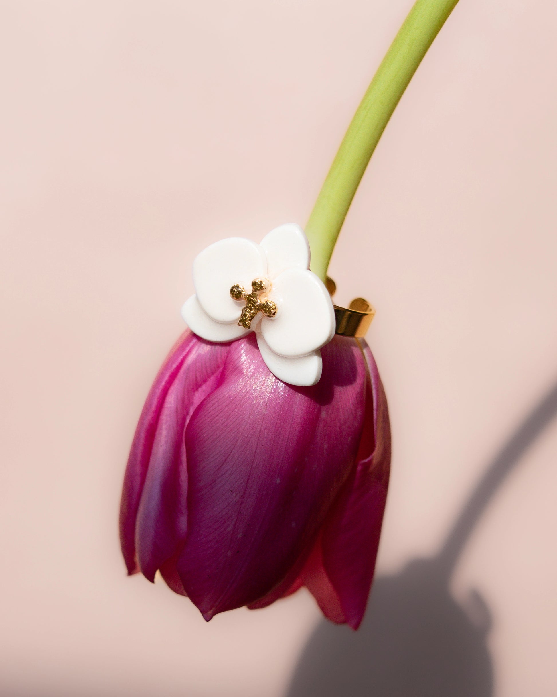 Confectionnée en argile polymère et protégée par une fine couche de résine, cette bague orchidée est montée sur une base en acier inoxydable hypoallergénique, adaptée aux peaux sensibles.