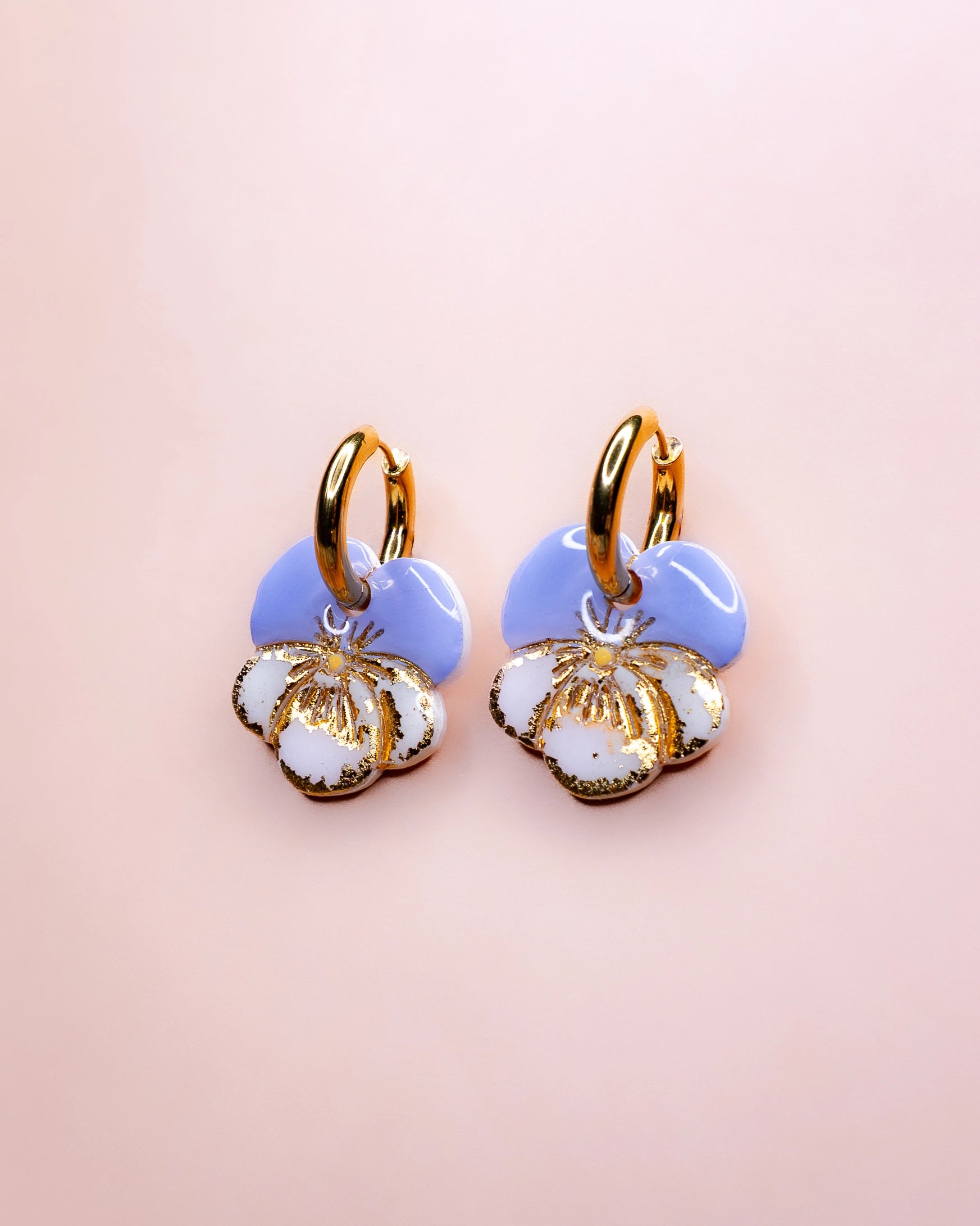 Confectionnées en argile polymère, ornées de feuilles d’or, peintes à la main et protégées par une fine couche de résine, ces boucles florales sont montées sur des créoles en acier inoxydable hypoallergéniques, adaptés aux peaux sensibles.