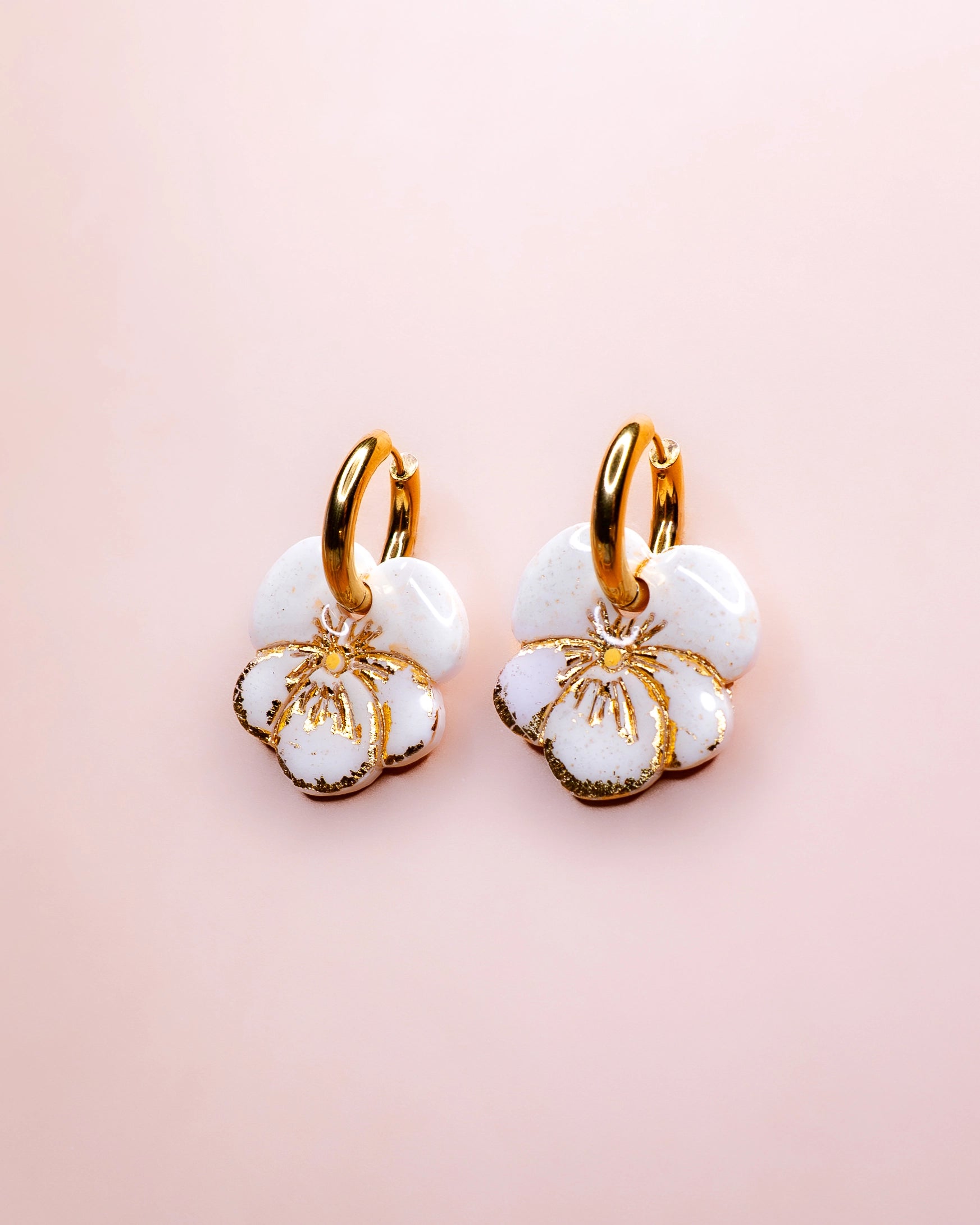 Confectionnées en argile polymère, ornées de feuilles d’or, peintes à la main et protégées par une fine couche de résine, ces boucles florales sont montées sur des créoles en acier inoxydable hypoallergéniques, adaptés aux peaux sensibles.