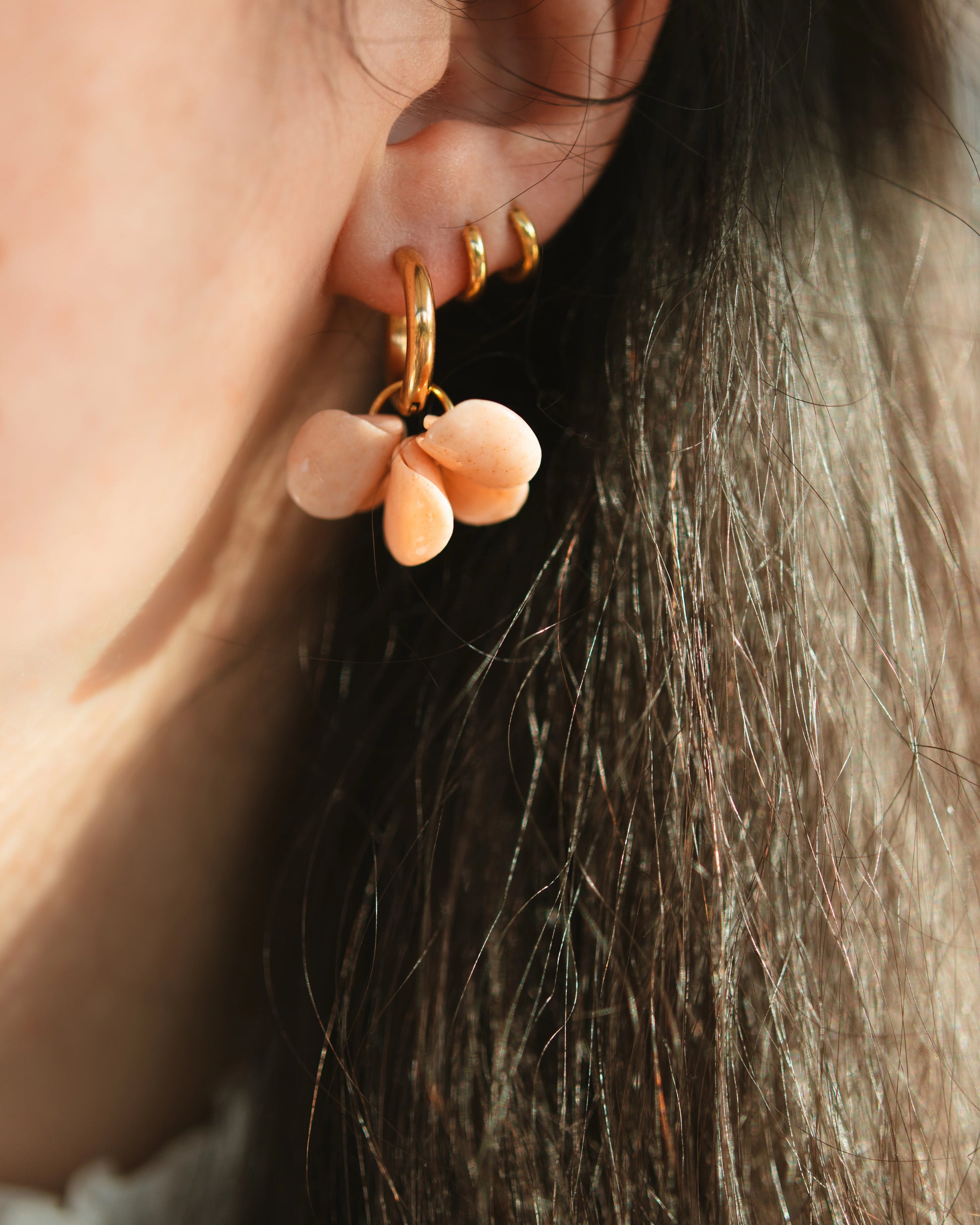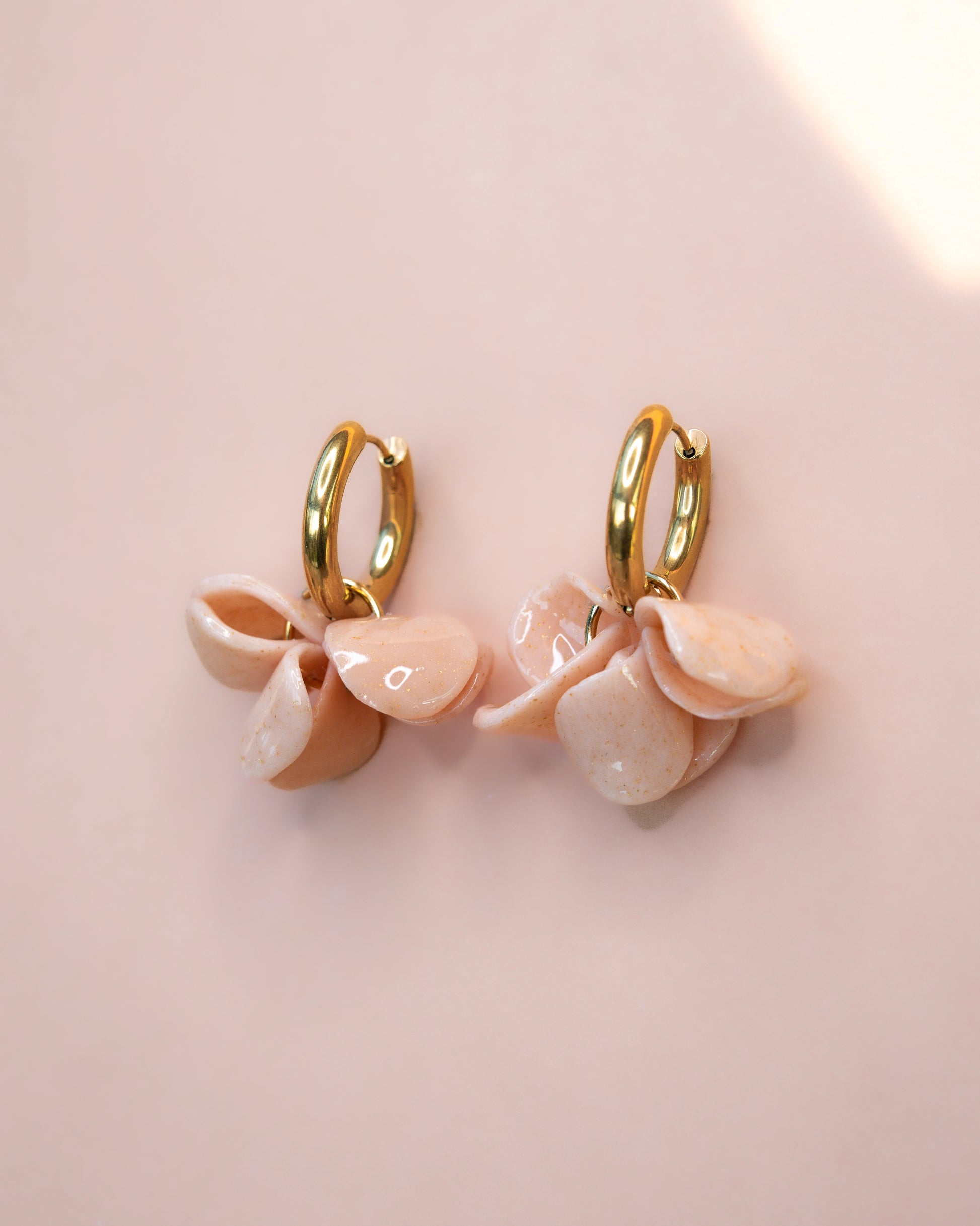 Confectionnées en argile polymère, ornées de feuilles d’or et protégées par une fine couche de vernis, ces boucles d'oreilles pétales sont montées sur des créoles en acier inoxydable hypoallergéniques, adaptés aux peaux sensibles.