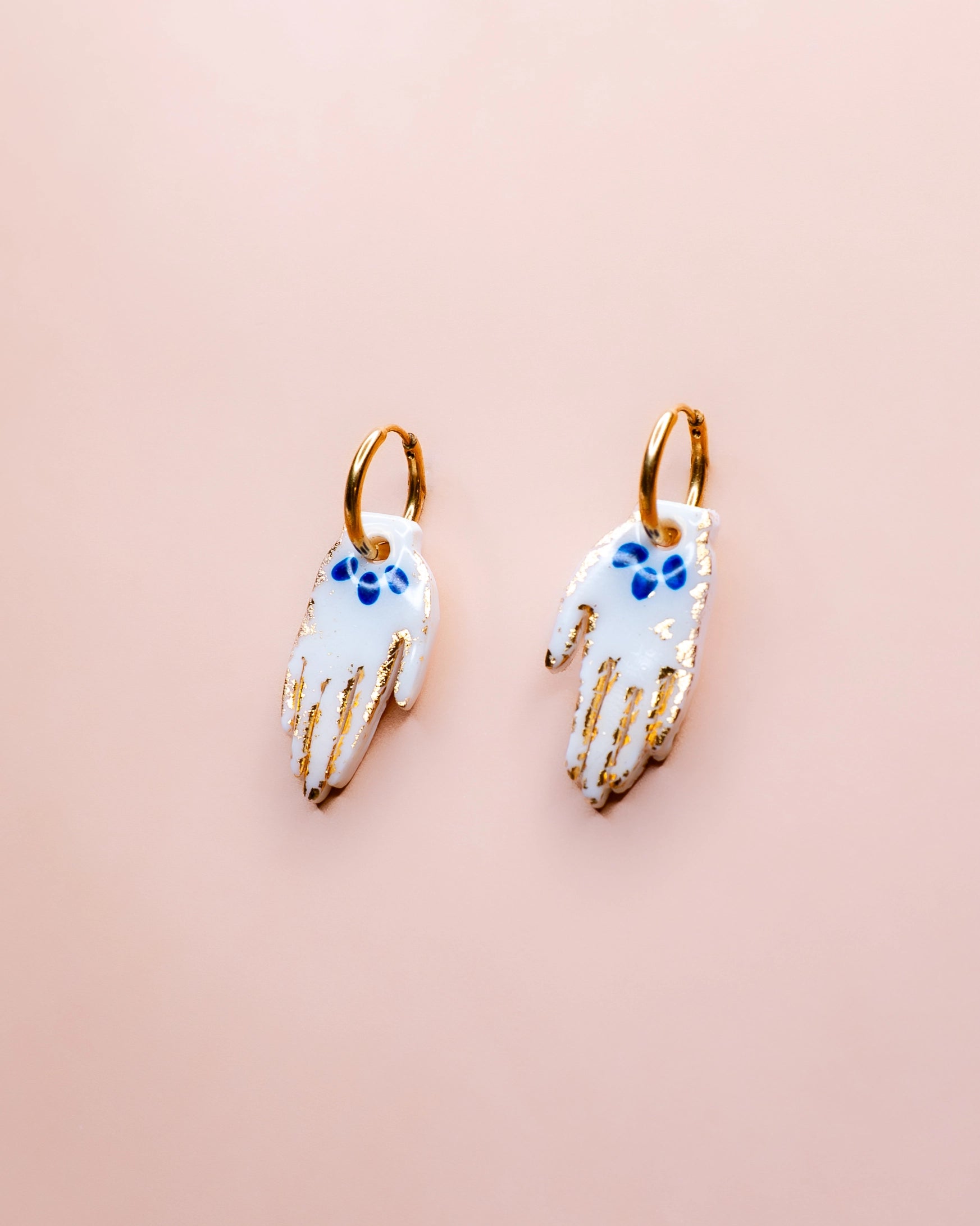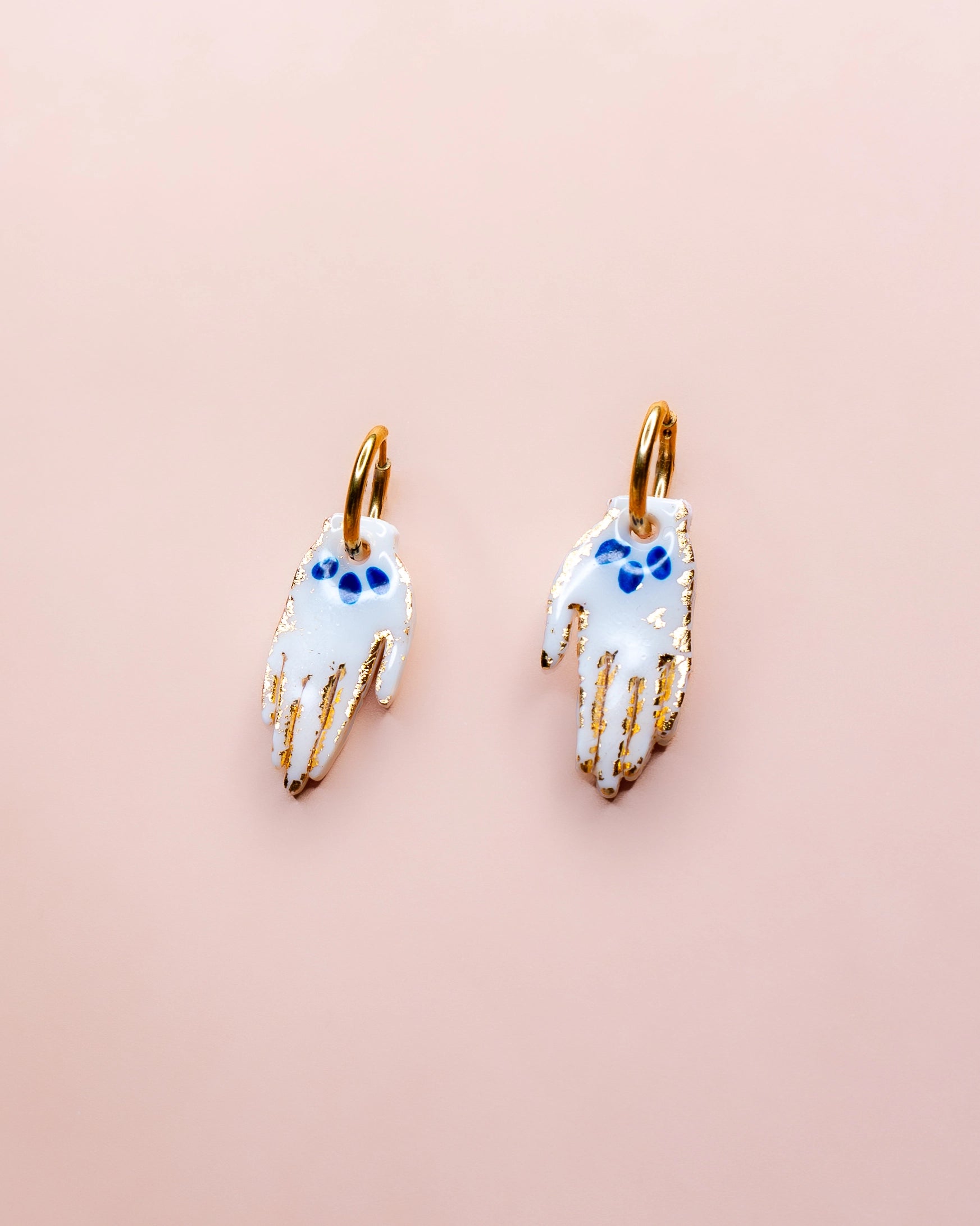 Confectionnées en argile polymère, ornées de feuilles d’or, peintes à la main et protégées par une fine couche de résine, ces boucles mains sont montées sur des créoles en acier inoxydable hypoallergéniques, adaptés aux peaux sensibles.