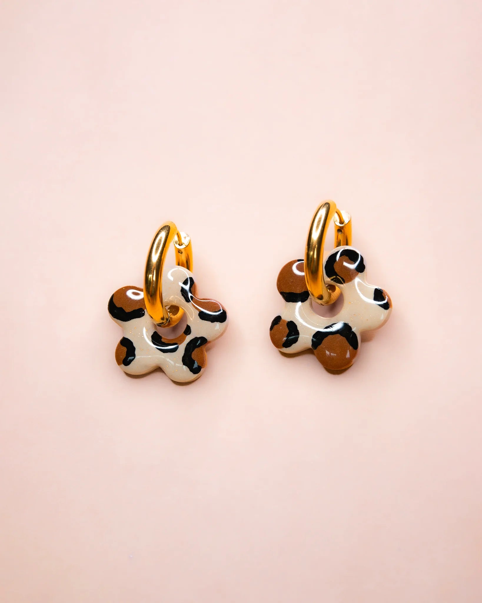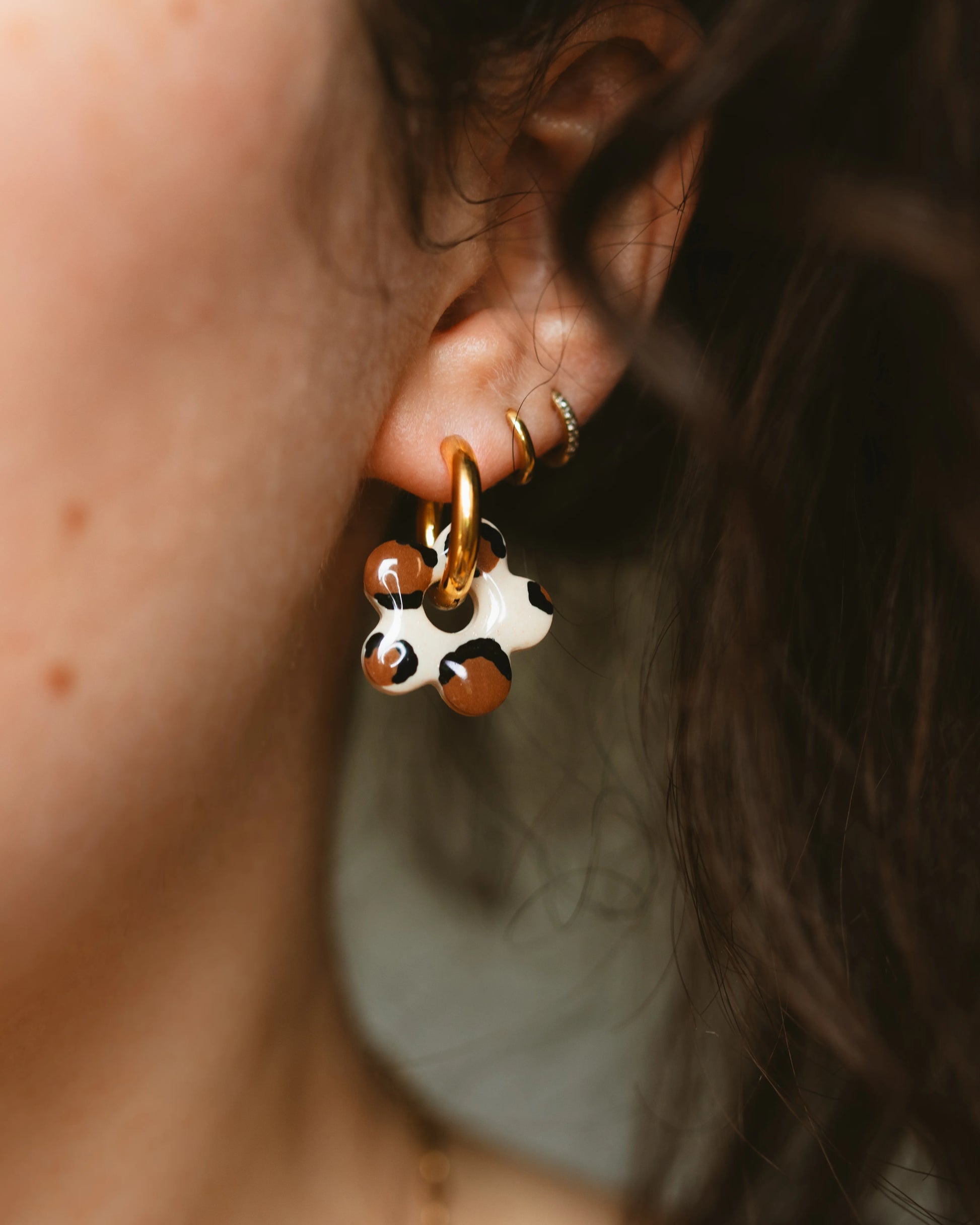 Confectionnées en argile polymère, peintes à la main et protégées par une fine couche de résine, ces boucles florales sont montées sur des créoles en acier inoxydable hypoallergéniques, adaptés aux peaux sensibles.