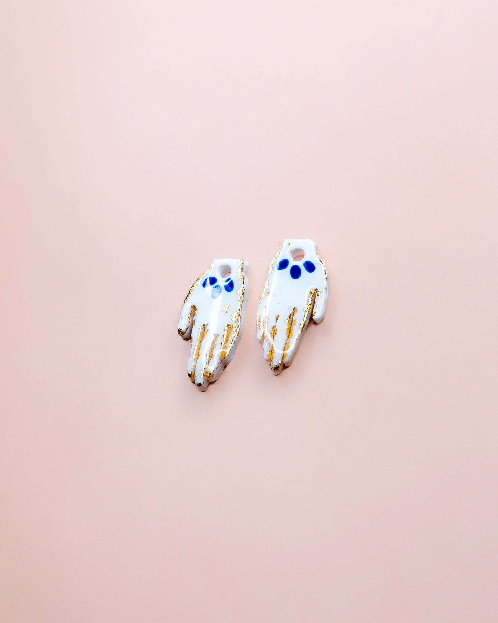 Affirmez votre style mystique. Confectionnées en argile polymère, ornées de feuilles d’or, peintes à la main et protégées par une fine couche de résine, ces pampilles légères se marient parfaitement à vos créoles préférées.