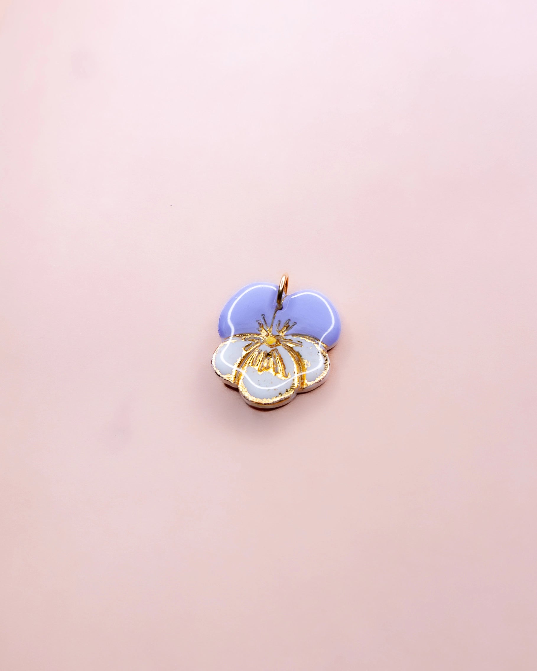 Sublimez votre collier préféré avec ce pendentif pensée, unique et floral. Confectionné en argile polymère, orné de feuilles d’or, peint à la main et protégé par une fine couche de résine, il est monté sur un anneau en acier inoxydable hypoallergénique, adapté aux peaux sensibles.